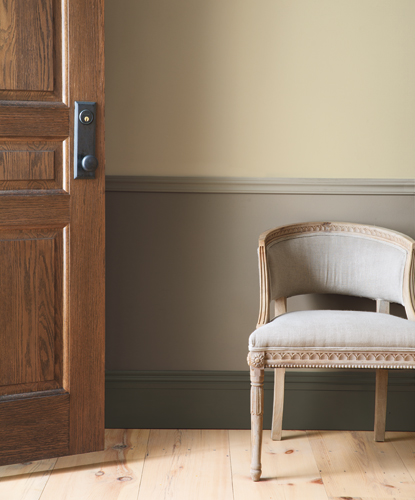 Here, we use Green Grove 2138-20 on the base molding, Briarwood HC-175 on the lower wall and Bleeker Beige HC-80 on the upper wall.