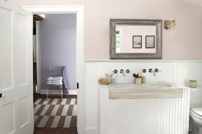 Εδώ, ένας παστέλ χρωματικός συνδυασμός δημιουργεί αρμονική ροή χρωμάτων από το μπάνιο στο διάδρομο. «Το Antique Pearl 2113-70, είναι ένα απαλό, αέρινο λιλά που τείνει προς το ουδέτερο και έχει μια νότα κόκκινου-ιώδους τόνου», εξηγεί η Hannah Yeo, Διευθύντρια Color Marketing & Ανάπτυξη στο Benjamin Moore. «Αυτός ο διακριτικός κόκκινος-ιώδης υποτόνος δημιουργεί μια απρόσκοπτη μετάβαση στον βιολετί διάδρομο, ζωγραφισμένο στο Lavender Mist 2070-60».